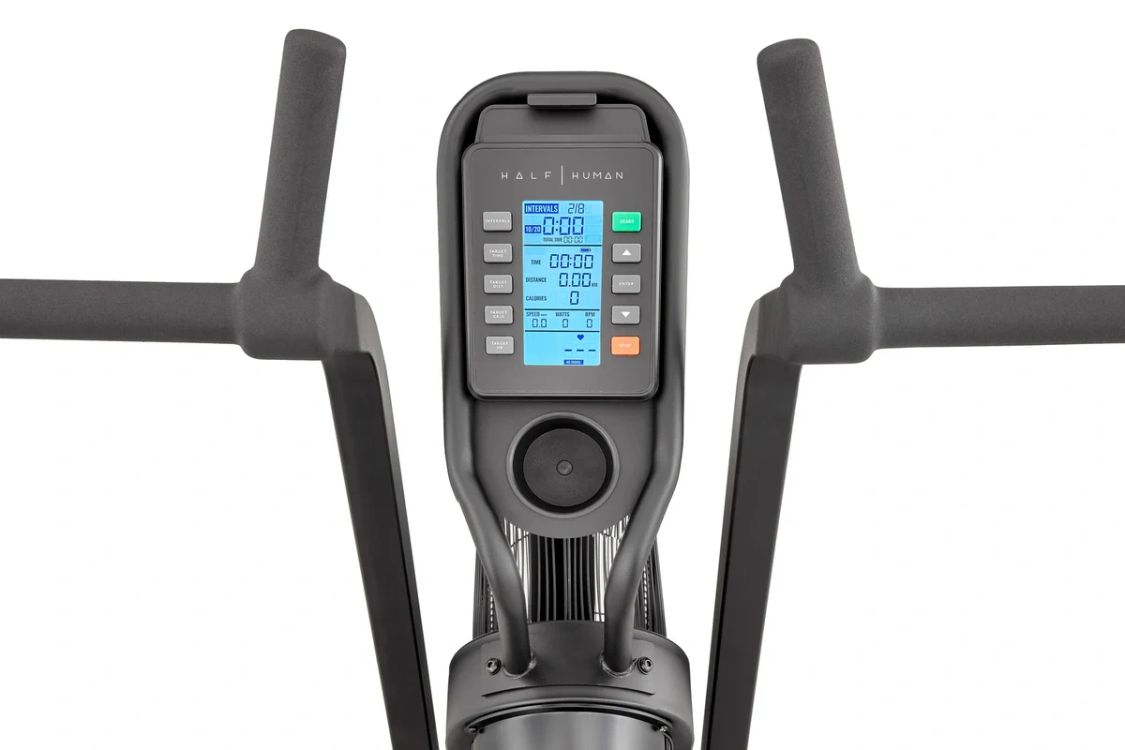 Featuring a robust, dual-action design for effective upper and lower body workouts, the Half Human air bike is an ultimate workout partner and a powerful, calorie-burning training tool. For a natural feel and a smooth pedalling motion, the bike has a fan resistance system delivering infinite resistance levels. With Bluetooth connectivity and an integrated tablet holder, the air bike lets you train with the compatible Zwift and Kinomap apps. Explore real outdoor routes, structured workouts with coaching and interval training, challenge your friends in a multiplayer mode or immerse yourself in exciting video-game style training. Keep track of your progress on a user-friendly 5” LCD display and choose from 8 programmes to challenge your stamina and strength.