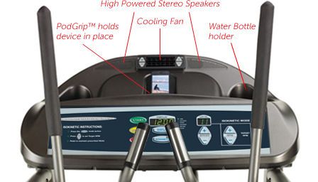 The High-Tech Entertainment Center comes standard on the E9 Rehabilitation Trainer. Included is an integrated reading/accessory rack; iPhone, iPod or MP3 connectivity with Landice PodGrip™; a personal cooling fan; high-powered stereo speakers; and a convenient water bottle holder.